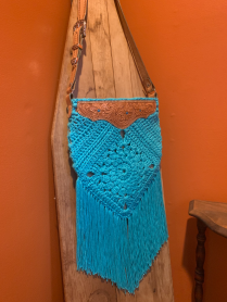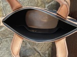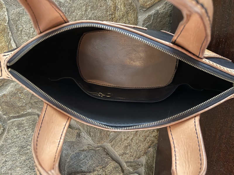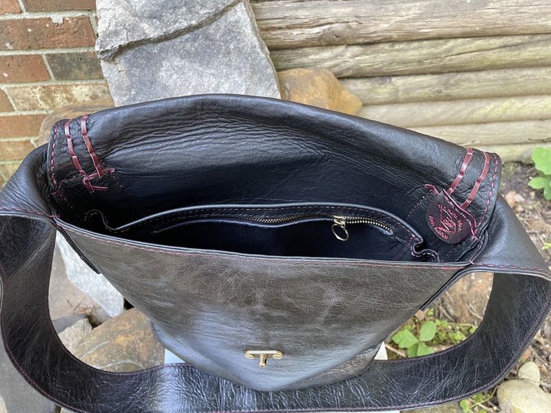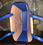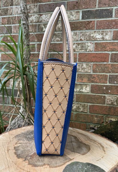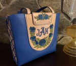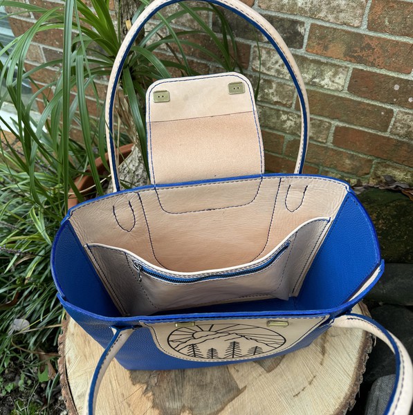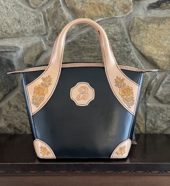 A commissioned build from a lady who requested blue roses and a monogram. It features two outside pockets with magnetic closures on the flaps. This is a slight modification of a pattern from a fellow leatherworker at dieselpunk.ro. The bottom was widened slightly and an interior zipper pocket was added.