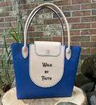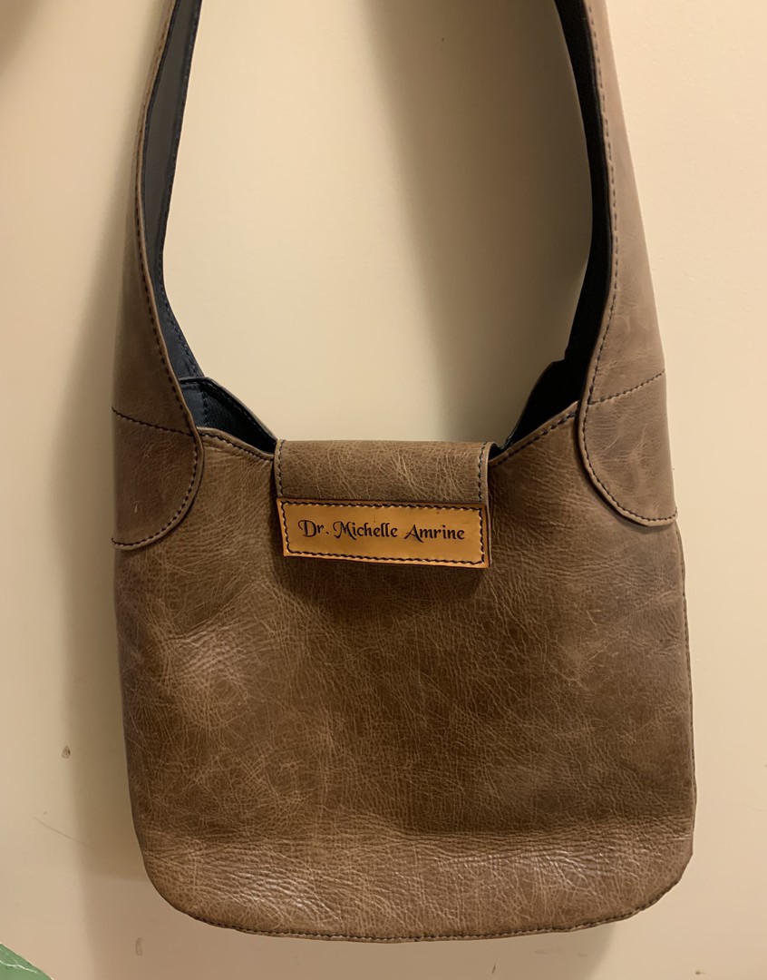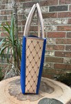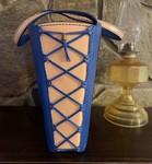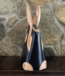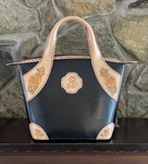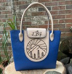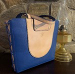 Another variation of the Corset Tote pattern from dieselpunk.ro. This was commissioned by a lady who loves God, hiking, and quilting. It features rolled handles, magnetic closure, and an interior pocket with smaller zipper pocket. The monogram and designs on the front and back panels were laser-engraved.