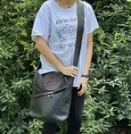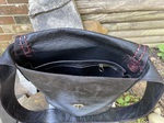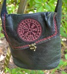 An oversize Boho bag. The customer requested black with burgundy stitching, burgundy lacing, an asymmetric flap, and a Viking "vegvisir" decoration.